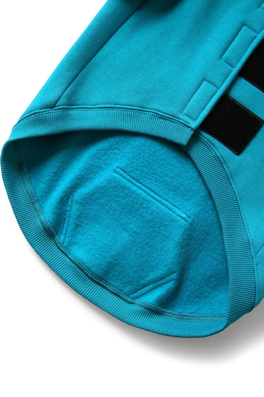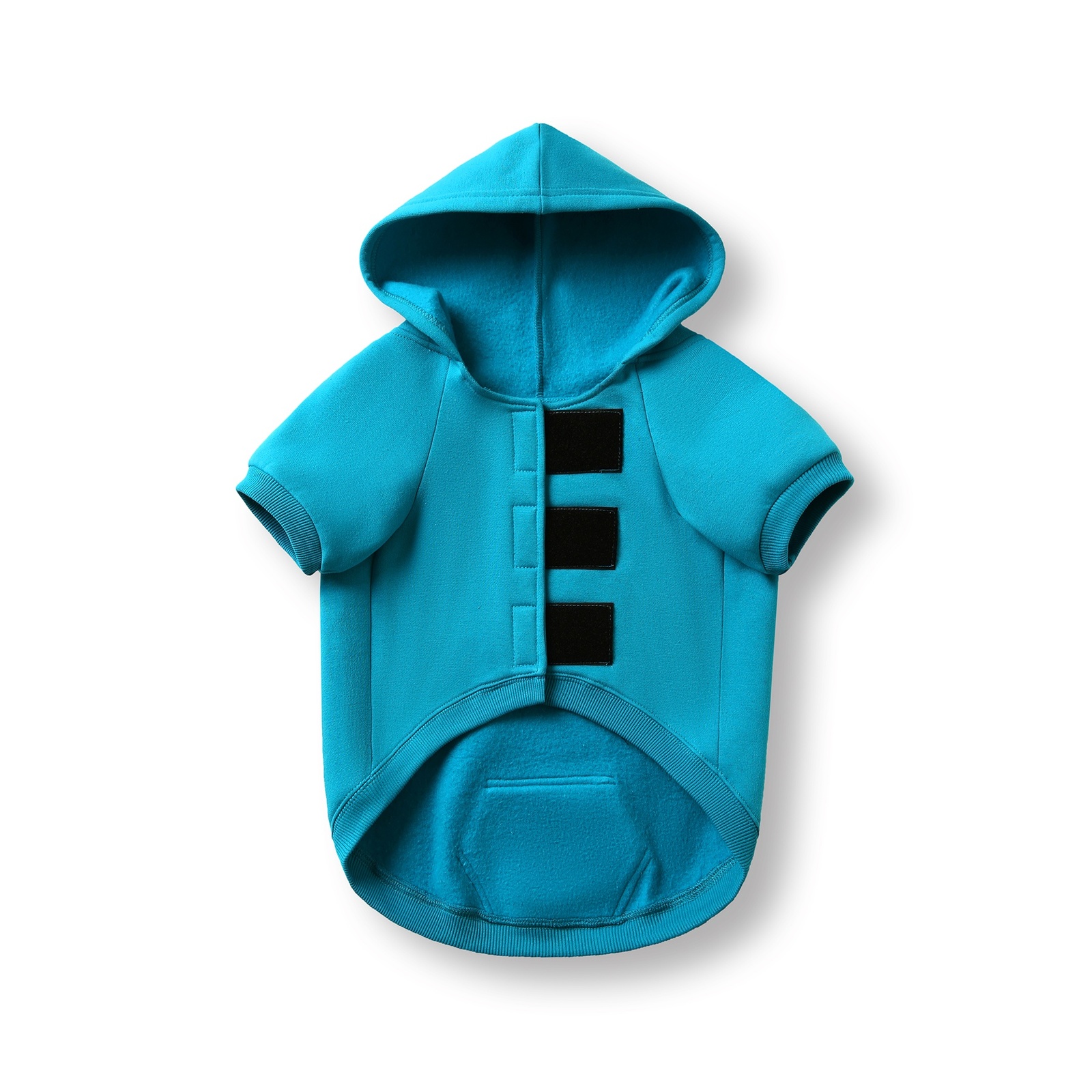 The back of the hoodie features an opening secured with Velcro, allowing it to wrap around and fasten under the dog's belly with adjustable support